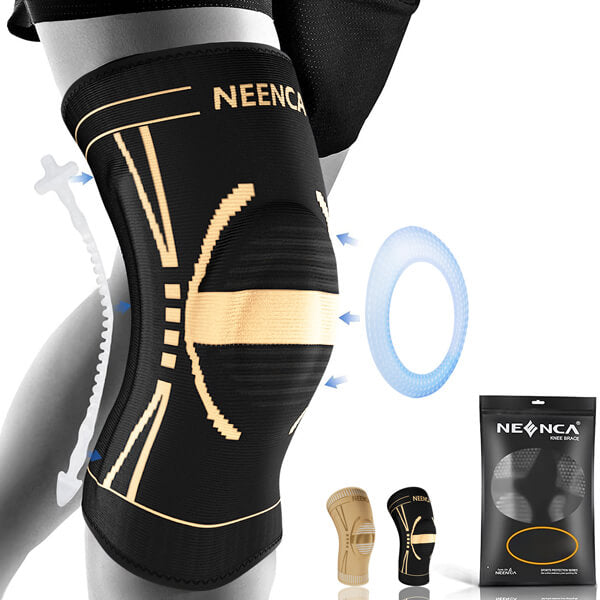 Exclusive patent - fusion of copper ion yarn technology: 3D knitting technology, knitting the yarn rich in copper ions up to 1500PPM and the high elastic fabric spandex into a deodorant and clean knee pad, and combined with ergonomics, the gel pad surrounds the kneecap, The double-sided metal spring stabilizer fits closely with your knee joint, these special functional elements strengthen the side support and maintain the stability of the joint. It can effectively disperse the pressure, keep the knee warm, and lubricate the joint.