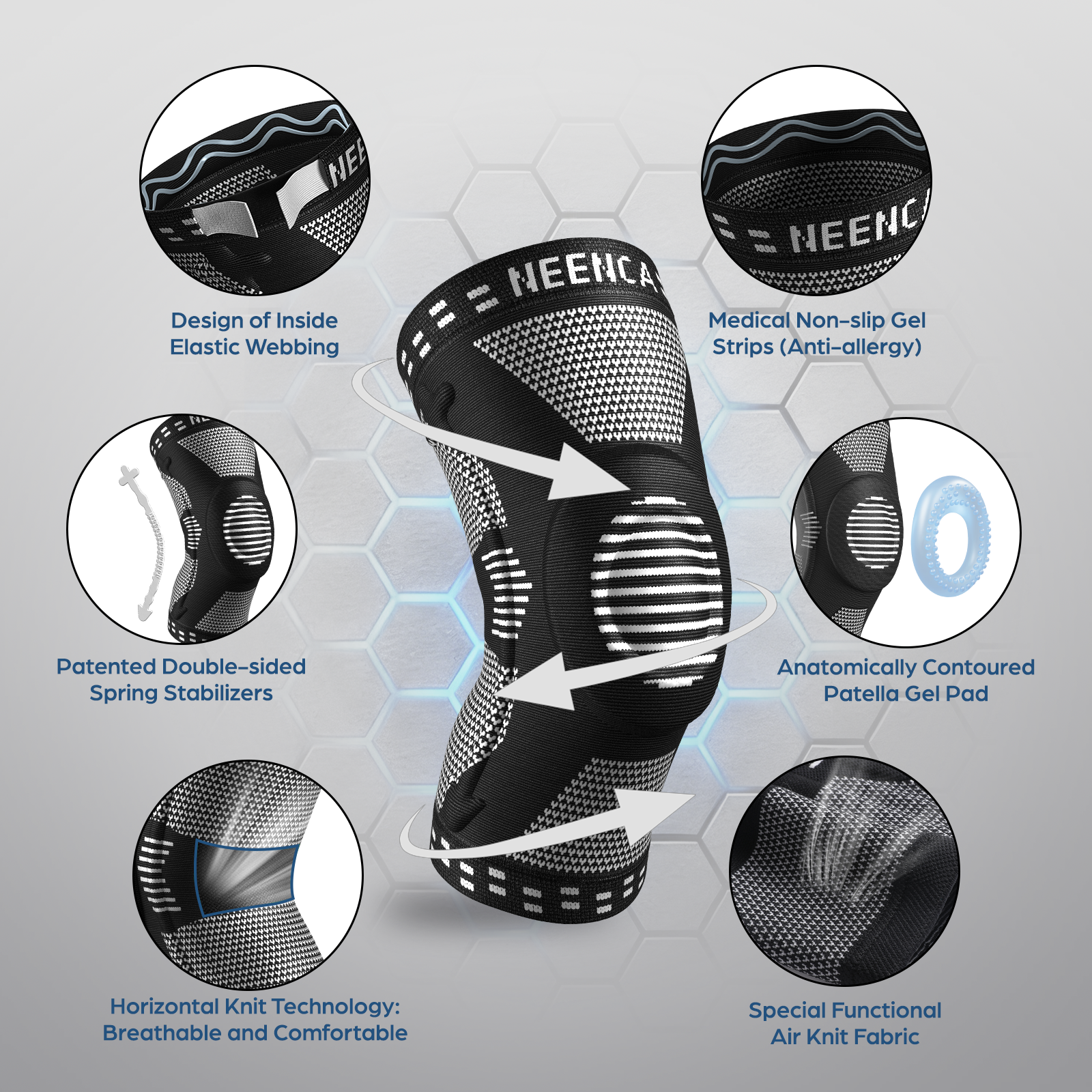 An anatomically contoured Patella Gel Pad surrounds the kneecap, while double-sided Spring Stabilizers fit tightly against your knee joint. These functional elements strengthen side support and maintain joint stability. It effectively disperses pressure, keeping your knee warm and promoting circulation. The BEST CHOICE for sports protection and pain relief.