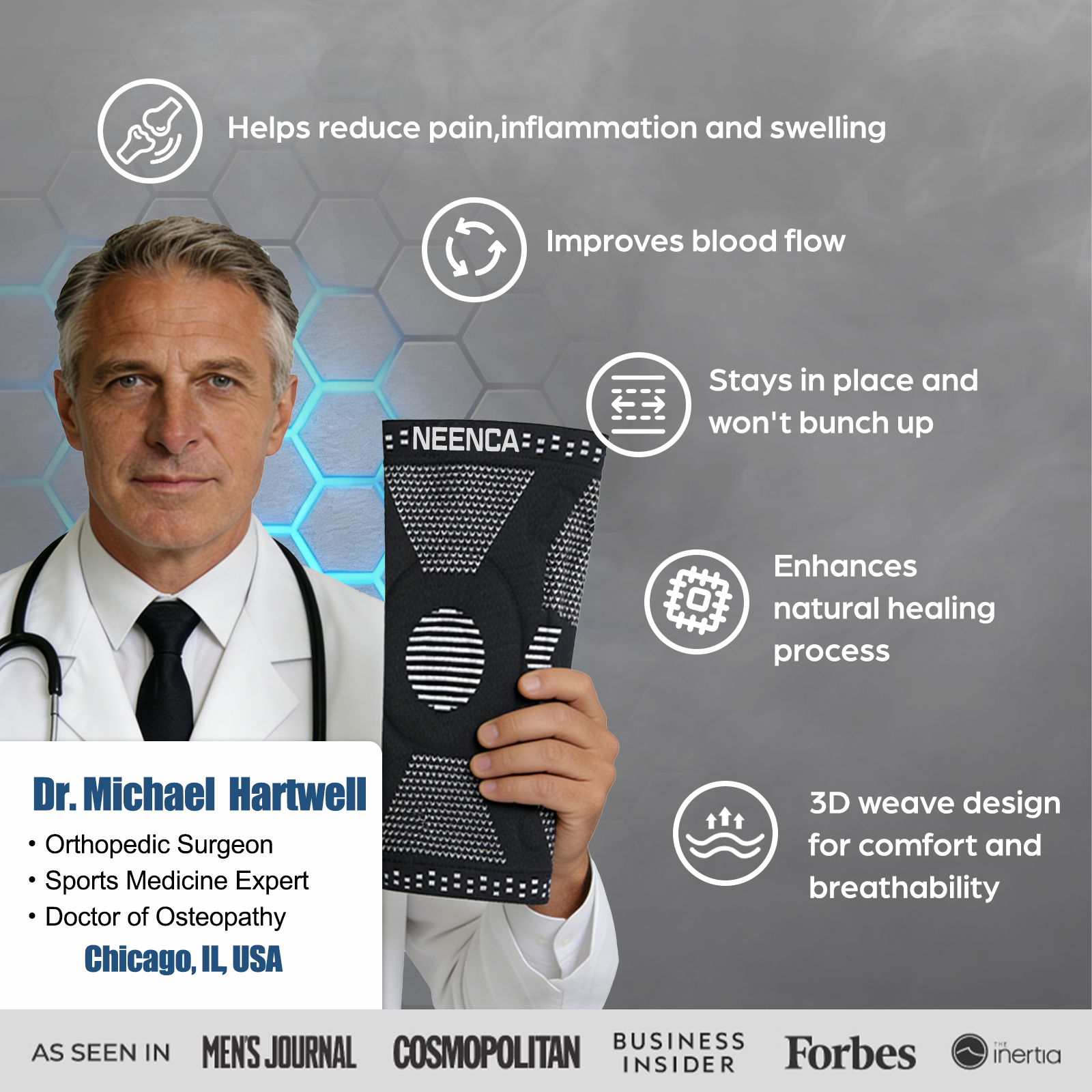 Neenca’s philosophy is simple: embrace life without limits. Our complete range of braces, supports, and compression products are designed to ease pain,reduce discomfort and empower you to live life to the fullest.