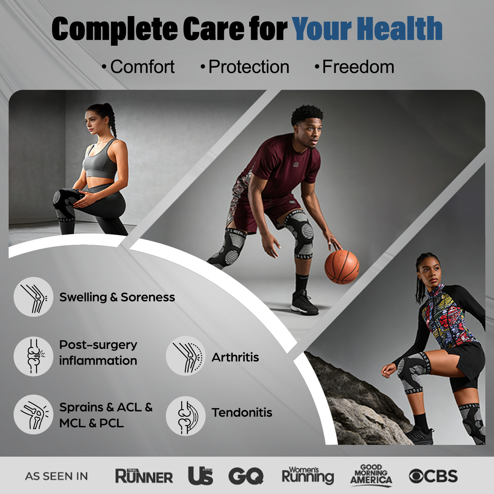 Engineered to stay in place. Unlike standard braces, our medical-grade knee sleeve features specialized spring stabilizers and gel pads that won't fall off during use. Detailed with non-slip silicone strips and high-elastic fabric to prevent sliding or rolling during exercise. Skin-friendly and breathable to prevent itchiness.